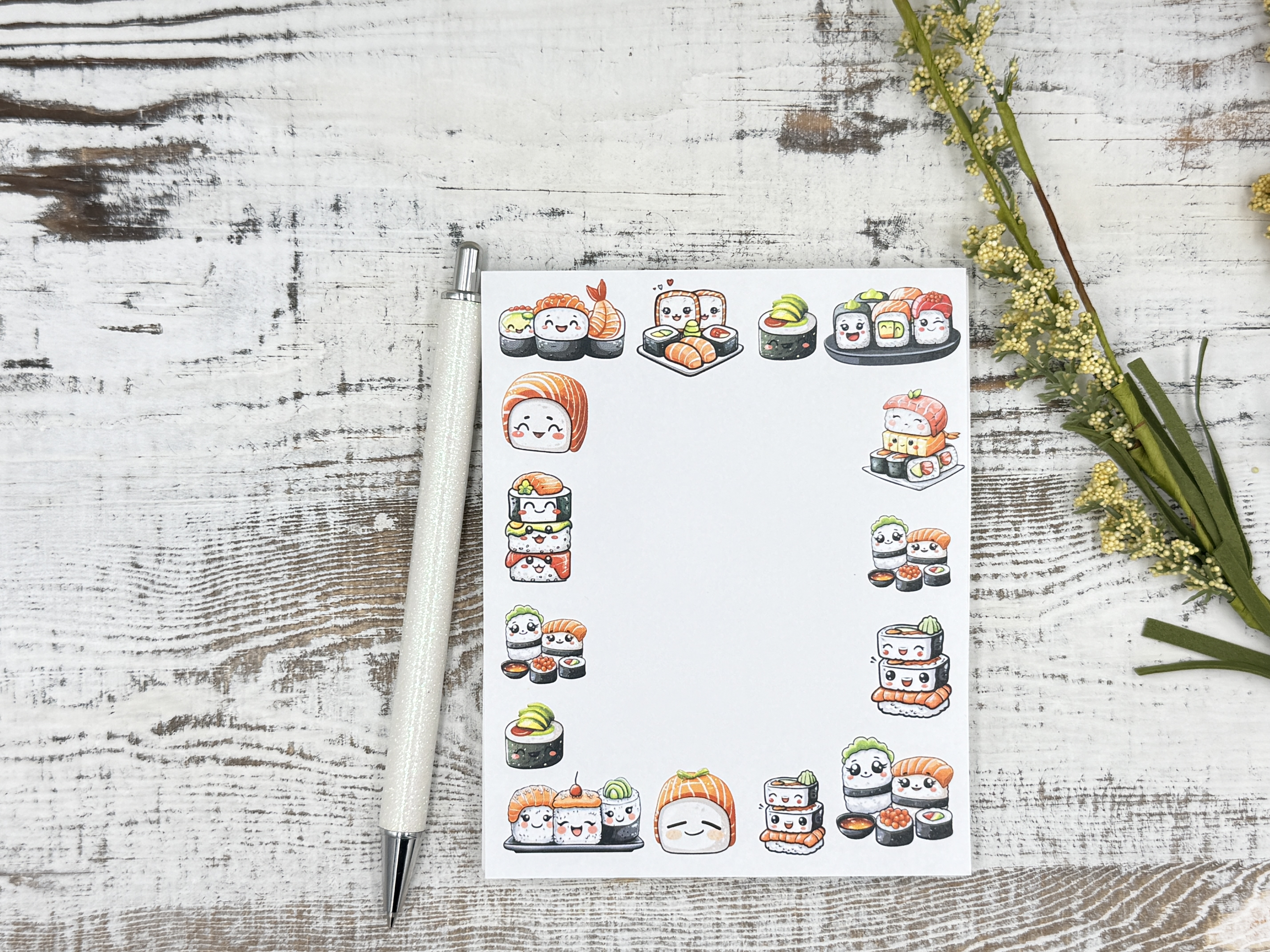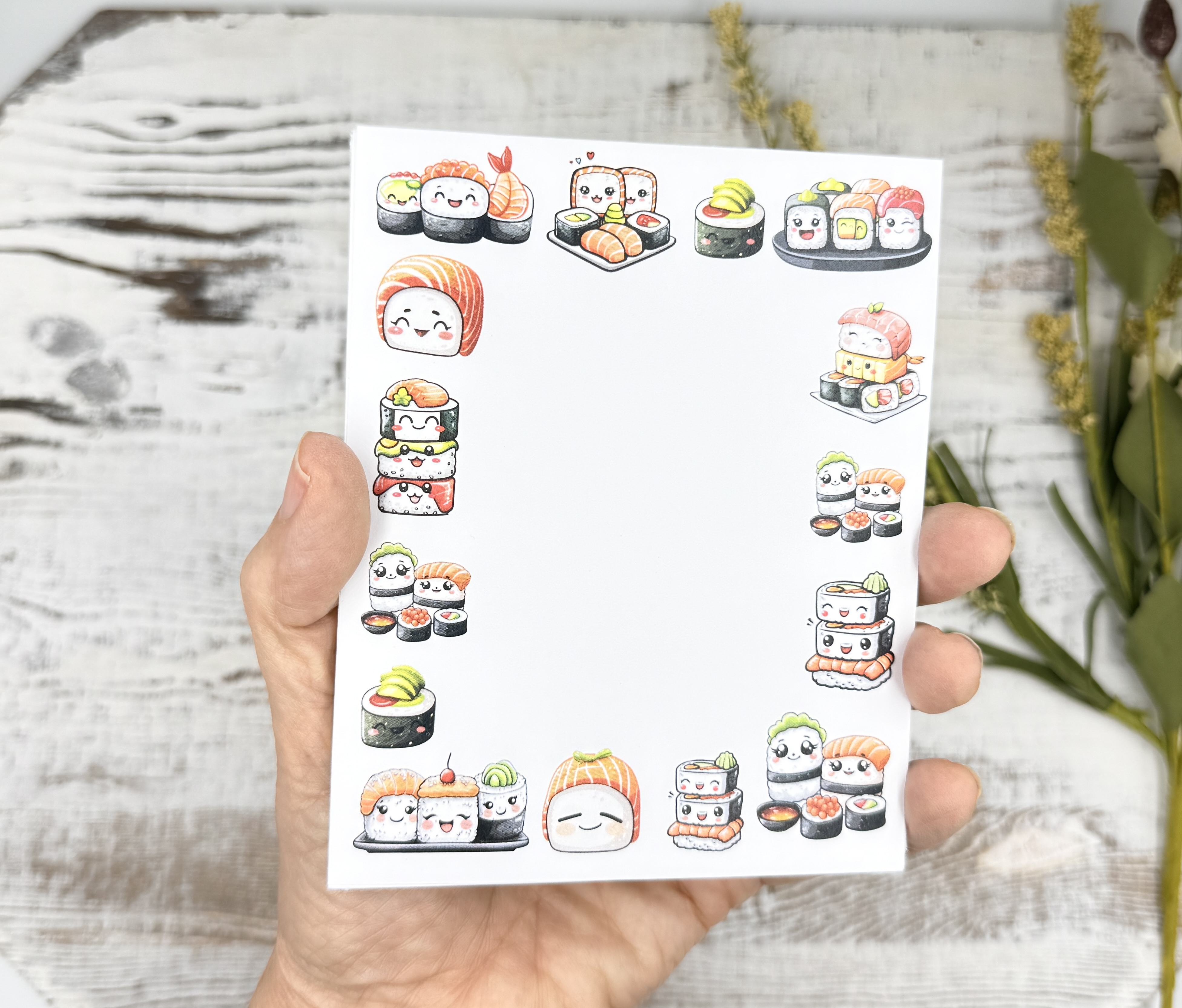 Add a little fun to your day with this adorable 4 x 5 inch Kawaii Sushi Unlined Notepad! Featuring sweet, smiling sushi illustrations around the outside border of the page, this notepad brings a cheerful touch to everyday notes, lists, and reminders.