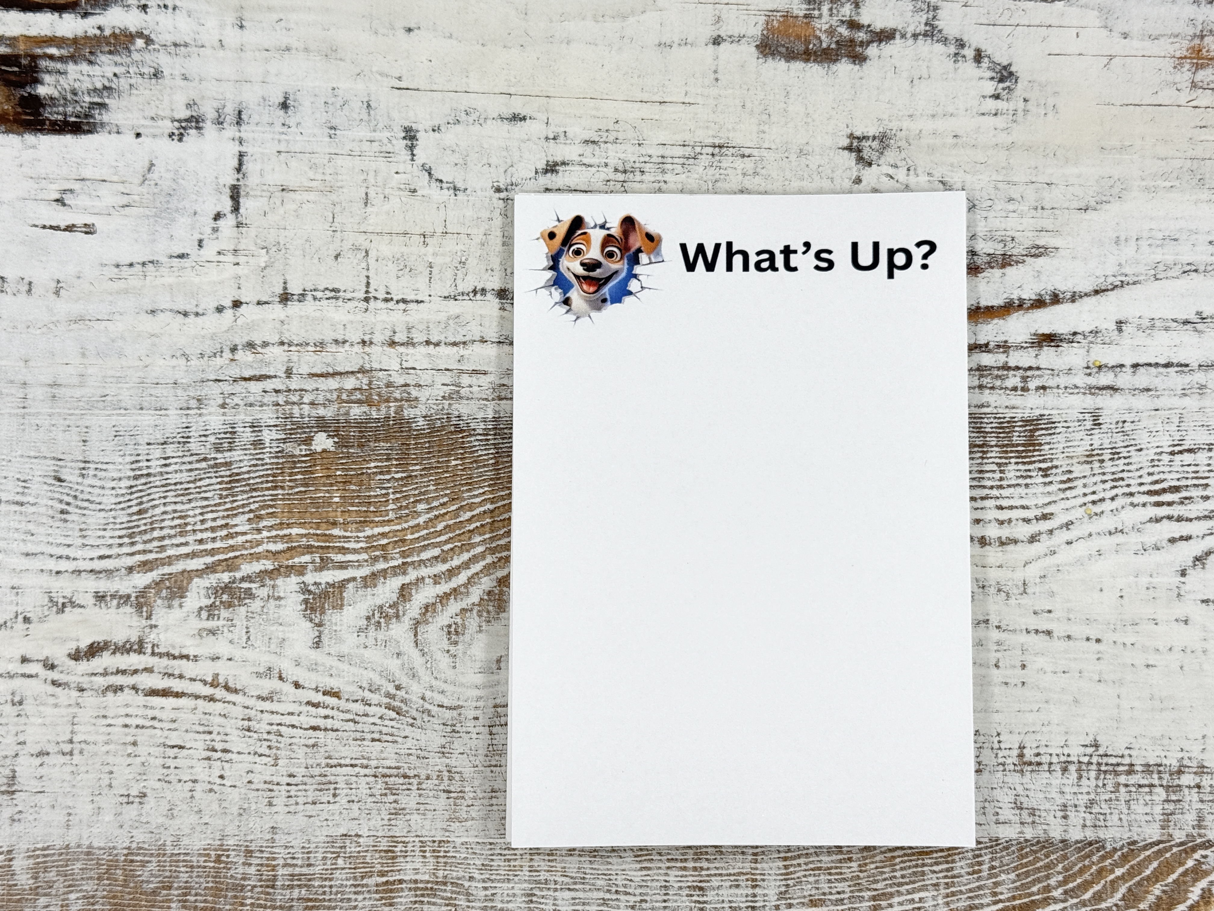Say hello in the cutest way with this fun 3.5 x 5 inch “What’s Up?” Dog Notepad! Featuring a playful 3D-style dog bursting out of the page, this notepad instantly grabs attention and adds personality to your everyday notes. The cheerful “What’s Up?” message at the top makes it perfect for casual lists, reminders, or friendly notes.